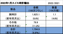 2022年1月から、スイス時計輸出の変化については、再び前年と比較いたします。1月のスイス時計総輸出は、前年同月と比べて6.8%増加しました。昨年11月と12月に見られた上昇トレンドは続いており、月別の総輸出金額は約17億スイスフランとなりました。(スイス時計協会FH スイス時計輸出月別レポートより抜粋)月別