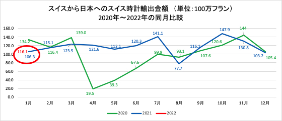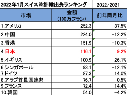 1月のスイスから日本へのスイス時計総輸出金額は、前年と比べ9.2%増加し、約1億1610万フラン(約145億1130万円)でした。1月以降、国内において新型コロナウィルスの変異株が急激に拡大し現在も感染の勢いは衰えていない状況ではあるが、日本向けの輸出結果は前年同月よりも好転しました。