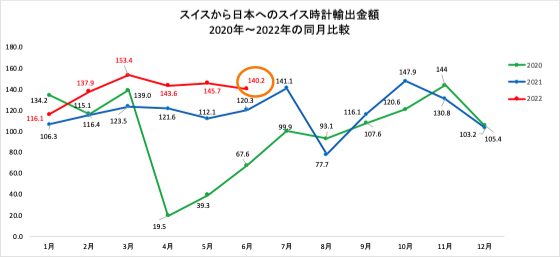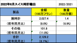 6月に日本へ出荷された腕時計については、金額で約1億3370万スイスフラン(約181億6250万円)で、前年同月比16.2%増加しました。数量においては前年同月と比べて35.5%の大幅な増加となり約4万6800個でした。