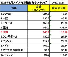 スイスから日本への輸出にフォーカスすると、6月単月では前年同月と比べ16.1%増加しており、総輸出金額は約1億4020万スイスフラン(約190億3910万円)でした。また、上半期の累計では、輸出総金額は約8億3700万スイスフラン(約1082億4080万円)で、前年同期間と比べて20%に近い伸びが見られ、日本市場の好調が確認できました。