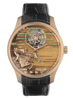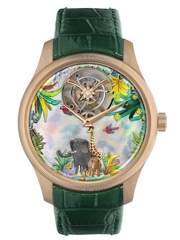 グッチは2025年、ハイウォッチメイキング第5世代コレクションとして“G-タイムレス”に5本の新作を加えた。いずれも40mm径のケースにダイヤモンドをセッティングしたトゥールビヨンを搭載し、ケースバックには手彫りのエングレービングを施すなど、クラフツマンシップを凝縮した仕上がりである。ダイアルデザインはアーカイブのシルクスカーフから着想を得ており、「フローラ プリント」はホワイトゴールドとグランフーエナメル、天然石の象嵌で花々を繊細に描き出す。「ヴェリエリ」はマザー・オブ・パールに海のモチーフをあしらい、木片を組み合わせた帆船のマルケトリーが存在感を放つ。「ペルラ」は海中の情景を表現し、レーザー加工後に手彩色した生物やヴェネチアングラスの球体が独自の輝きを添える。さらに「サファリ プリント」を採用したローズゴールドモデルは、サバンナの風景や野生動物を細密に描写。「エクエストリアン」はオリーブウッド40ピースのマルケトリーとローズゴールドの騎手像でダイナミックな躍動感を表現する。いずれのモデルも芸術性と機械美を融合させた、グッチならではのハイウォッチメイキングである。