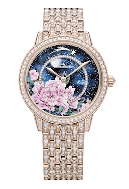 ダイアルは3層構造で、最上層のサファイアクリスタル製ダイアルには、精緻に描かれた星々とともにラッカーで表現されたピオニー(芍薬)が咲く。ピンクのピオニーは9色のラッカーを重ね約110時間、ブルーは12色を駆使して約90時間を要し、職人が手作業で描き上げている。