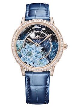 ピンクのピオニーが描かれたモデルにはダイアモンドをちりばめた18KPGブレスレットが付属し、ブルーのピオニーが描かれたモデルにはブルーのアリゲーターストラップが付属する。それぞれ世界限定10本のみという希少性を誇る。