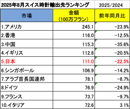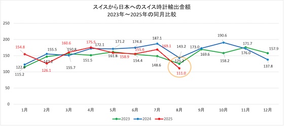 8月のスイスから日本へのスイス時計輸出総金額は、約1億1100万スイスフラン(約203億8290万円)で、前年同月と比べて22.5%の大幅な減少となりました。