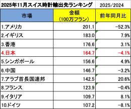 11月の日本向け腕時計の輸出額は約1億5800万スイスフラン(約303億5500万円)で、前年同月比4.3%減少。輸出数量は5万674個と17.6%減少しました。
