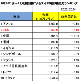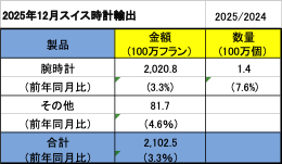 また、2025年通年の日本向けスイス時計輸出金額は、前年比5.8%減の約18億5,090万スイスフラン(約3,330億7,000万円)となりました。