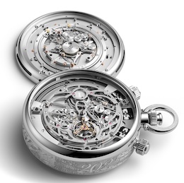 外装全面にハンドエングレービングを施し、創業者の肖像や150周年ロゴを刻む。サファイアクリスタル製の音響板を備え、チャイミング機構の音響性能を高めている。文字盤はブルーのグラン・フー・エナメル仕上げで、18Kホワイトゴールド製ローマ数字や星空モチーフを手彫りで装飾している。