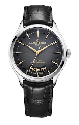 ボーム&メルシエは、2月17日から始まる旧正月を祝い、クリフトンコレクションから100本限定の特別モデルを発売した。2026 年は、7番目の干支である火の馬の年。太陽とのつながりを持ち、パワーとエネルギー、自由を象徴する馬をダイヤルに表現した。6 時位置の扇形のデイト窓には、奇数日はアラビア数字と漢字で、そして偶数日には異なる姿勢の馬が表示され、ディスクが早く回ると一頭の馬が疾走しているように見える。グラデーションのラッカー仕上げを施したダークグレーダイヤル上の要素はゴールドカラーでまとめ、コントラストが美しい。チャイニーズニューイヤーとボーム&メルシエが継承する創造性と高品質が融合した本作は、心臓部に搭載した自社製自動巻ムーブメント、ボーマティックはCOSCクロノメーター認定で、約120時間のパワーリザーブを備える。
