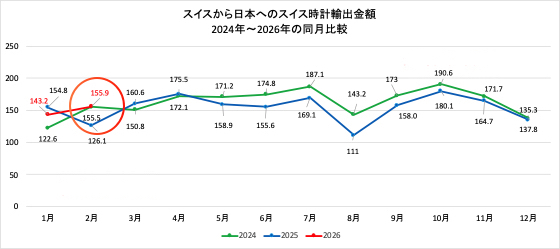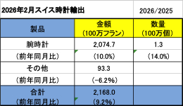 2026年2月の日本向け輸出は、前年同月比23.7%増と大幅な伸びを示し、約1億5600万スイスフラン(約311億6400万円)に達した。この日本市場の好調な動きは、スイス全体の総輸出金額が再び増加基調へと回帰するうえで、ポジティブな影響を与えている。