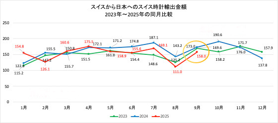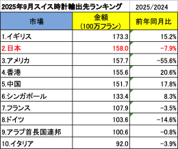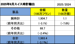 2025年9月におけるスイスから日本への時計総輸出額は、約1億5,800万スイスフラン(約292億6,000万円)で、前年同月比7.9%の減少となりました。