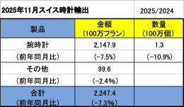11月の日本向け腕時計の輸出額は約1億5800万スイスフラン(約303億5500万円)で、前年同月比4.3%減少。輸出数量は5万674個と17.6%減少しました。
