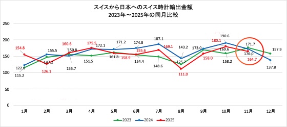 また、11月までの日本向けの輸出額の累計は、17億1480万スイスフラン(約3062億2900 万円)で、前年同期間と比較して6.2%の減少となっています。下記グラフ「2023年〜2025年の同月比較」からは、11月までの輸出金額は前年水準を下回っているものの、全体としては、前年と概ね同様の推移を示していることが確認できます。