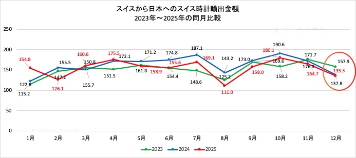 また、2025年通年の日本向けスイス時計輸出金額は、前年比5.8%減の約18億5,090万スイスフラン(約3,330億7,000万円)となりました。