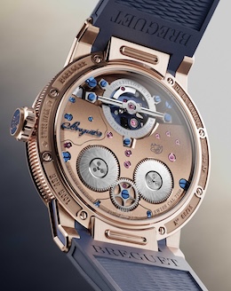 The display adopts a regulator-style layout inspired by the 1820 marine chronometer. Positioning the hour indicator at 6 o'clock, the minute hand at the center, and the tourbillon at 12 o'clock achieves a high-level fusion of mechanical symmetry and readability. The case employs the proprietary Breguet Gold alloy, with the same material extending to the movement's mainplate.