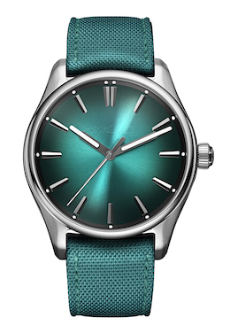シンプルな意匠を纏ったスポーツ・ウォッチの“パイオニア・コレクション”に、ターコイズ・カラーの文字盤が特徴の新作モデルが登場した。12気圧の防水性を備えたラウンド・ケースには、サンバースト仕上げが施されたブルー・ラグーンのダイアルが配されており、12時には“H.Moser & Cie.”のロゴタイプが描かれる。フランジと針にはスーパルミノヴァ®︎が塗布され、暗闇でも時刻が読み取り易く向上された。ストラップは文字盤とコーディネートさせたケブラー(写真)、レザー、ラバー、ステンレス・スチール製ブレスレットの組み合わせがある。