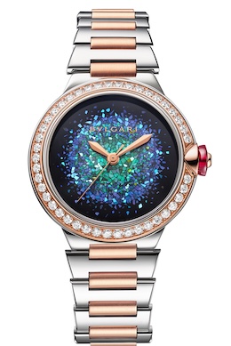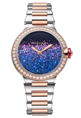 ブルガリは漆芸作家・浅井康宏氏と協業した「ルチェア ノッテ デ ルーチェ」を発表した。ルチェアの光の美学を踏まえ、浅井氏による螺鈿蒔絵を文字盤に配した本作は、文字盤の趣をふたつのバリエーションで展開するのが特徴だ。研炭(とぎすみ)による丹念な研磨は、漆の各層の奥行きを引き出し、浅井氏が色と形にこだわって厳選したマザー・オブ・パールの薄片が漆面上で優美なモザイクを構成する。最終研磨を経てそのモザイクは深い黒漆の闇の中に鮮やかに浮かび上がる。ひとつのダイアル制作には約60日を要し、完成したダイアルはいずれも唯一無二の個性を宿す。ケースのベゼルにはダイヤモンドをセッティング。サファイアクリスタル風防を通して、角度により異なる表情を見せる文字盤の繊細な光彩を堪能することができる。世界限定各80本だ。