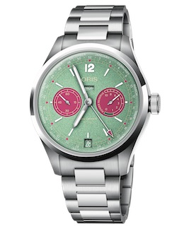 1938年の初代に端を発する「ビッグクラウン」の伝統を、自社製ムーブメント開発の革新と大胆なデザインで刷新するモデル。ダイアルは鮮やかなミントグリーンを基調に、ローズピンクのアクセントを添え、針とインデックスにはゴールドとホワイトを配色。情報量の多さを感じさせず、強いコントラストで高い視認性を確保している。