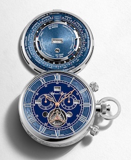 外装全面にハンドエングレービングを施し、創業者の肖像や150周年ロゴを刻む。サファイアクリスタル製の音響板を備え、チャイミング機構の音響性能を高めている。文字盤はブルーのグラン・フー・エナメル仕上げで、18Kホワイトゴールド製ローマ数字や星空モチーフを手彫りで装飾している。