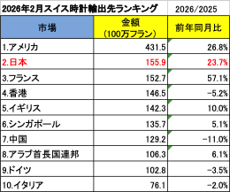 年初はやや低調なスタートとなったスイス時計輸出は、2月に入り再び成長軌道へと回帰した。輸出額は22億スイスフラン(約4333億8320万円)に達し、2025年2月比で9.2%の増加を記録した。この結果にはベース効果による押し上げも一部見られるものの、主に主要3市場(アメリカ、日本、フランス)における力強い成長が全体を牽引したことが大きな要因となっている。